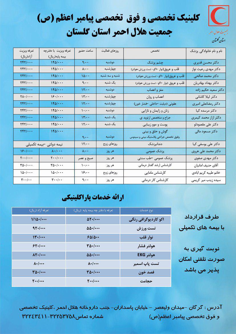 کلینیک تخصصی و فوق تخصصی پیامبر اعظم(ص) جمعیت هلال احمر استان گلستان با تعرفه نیمه دولتی آماده خدمات رسانی به آحاد مردم می باشد.